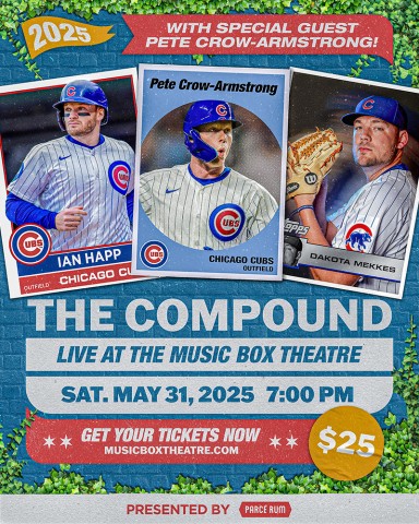 Join Chicago Cubs All-Star Outfielder Ian Happ at the historic Music Box Theatre, just blocks away from Wrigley Field on Saturday, May 31st for a special live event for the Compound Podcast! Happ will be joined by his co-hosts Dakota Mekkes and Tom Prizeman for a special live event you won't want to miss. The trio will also welcome to the stage several Cubs special guests, to be announced. Doors open at 6:30, with the show starting at 7. VIP Tickets with a meet and greet are also available, VIP reception will be after the show.